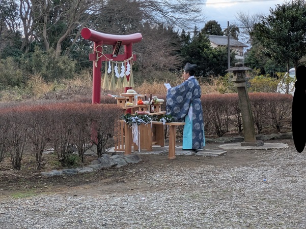 ・日の出岬の鳥居前にて初日の出に向かい祝詞を挙げる様子